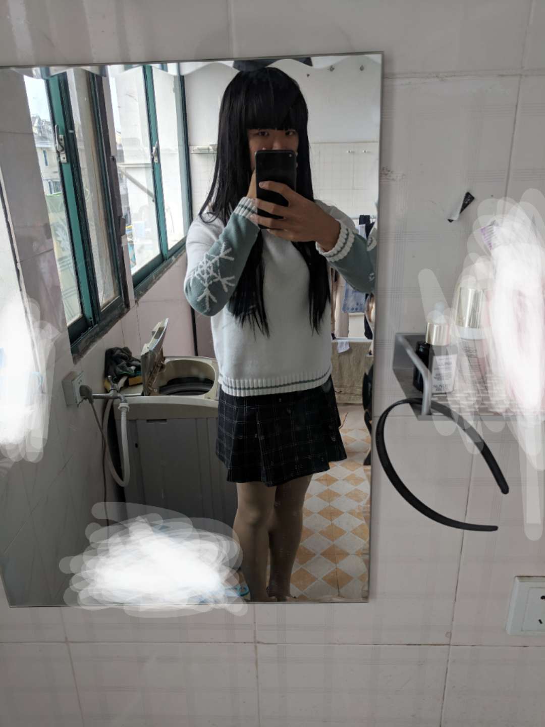 add two picture: sweater; face without spectacle; incarnadine tights with leafers-like shoes
